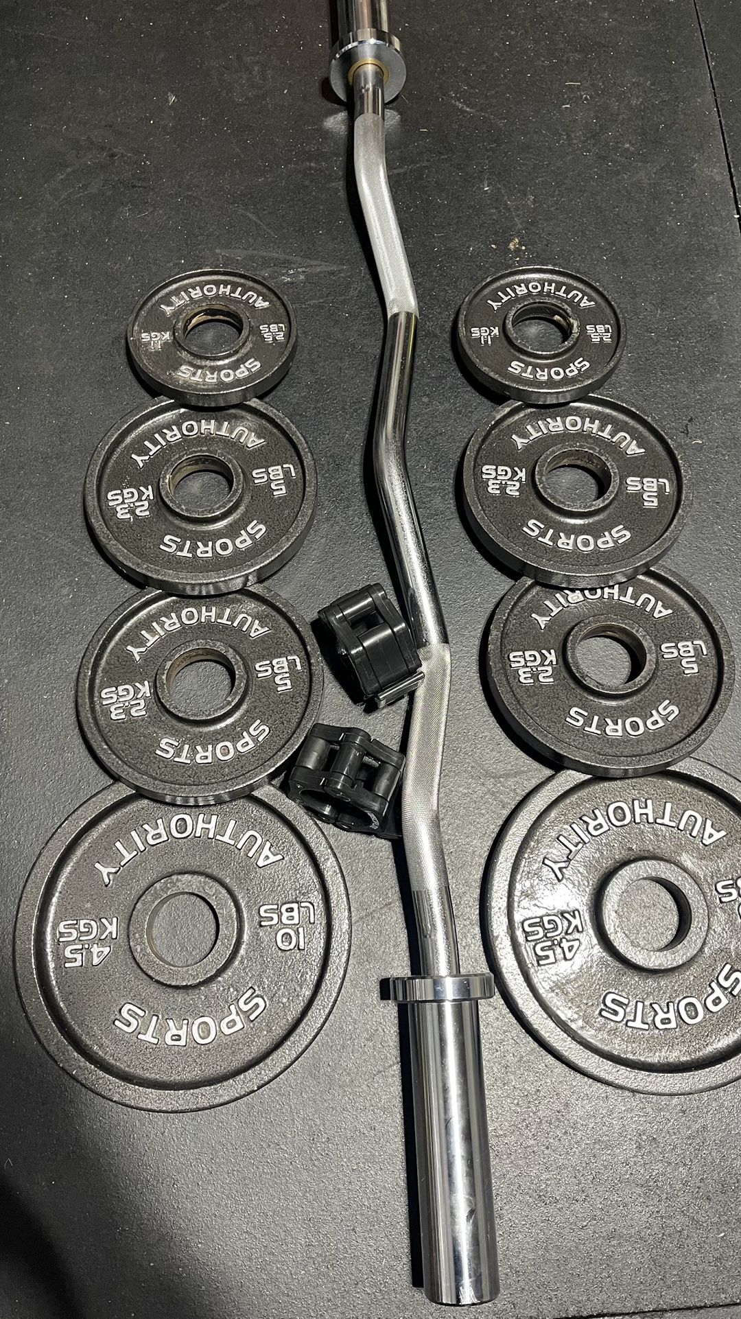 Use in Good condition set of olympic Weights including 2-10s. 4-5s. 2-2.5s, a brand new heavy duty curlbar and pairs of new clamps Asking $120 firm !! LOW BALLERS WILL BE IGNORED!!