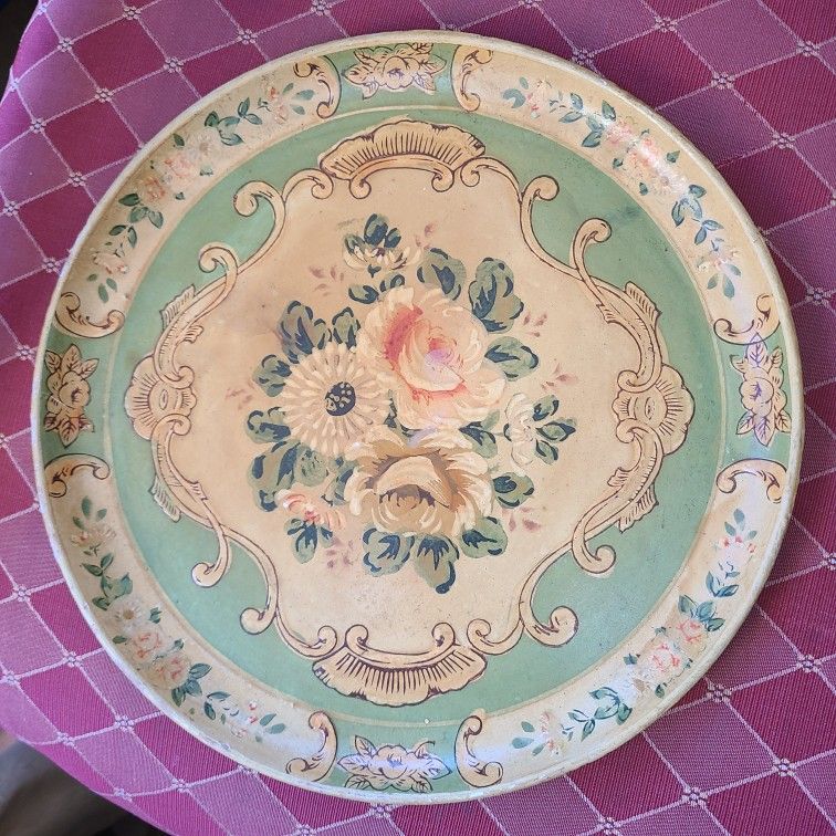 Very pretty round floral pattern vintage serving or vanity tray lacquered paper papier mache wood product. The back is stamped with; "Made in Occupied Japan". In excellent vintage condition,see picture for slight rub on edge measures 10.5" across