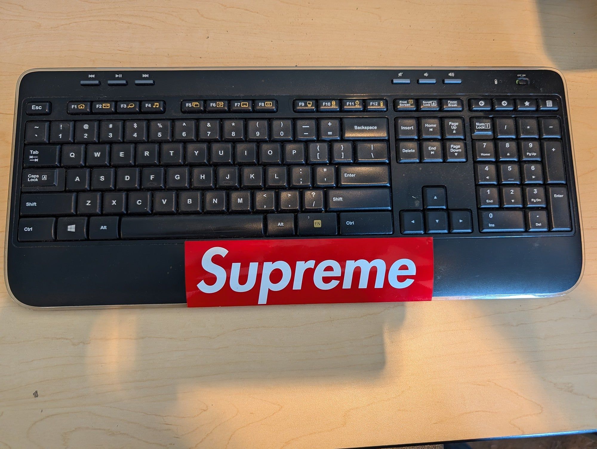 This is a Logitech K520 full-size wireless keyboard in black. It features a standard QWERTY layout with a numeric keypad and dedicated media control keys. A red 'Supreme' sticker is applied to the palm rest.