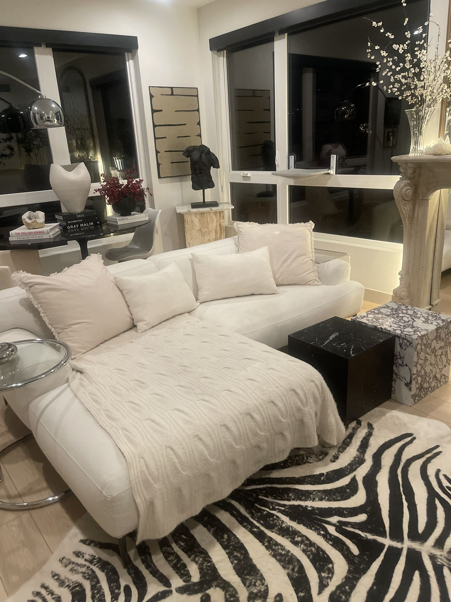 This is a cream thick linen l shaped sofa. Some mild stains but in very good condition. Originally 2 k.