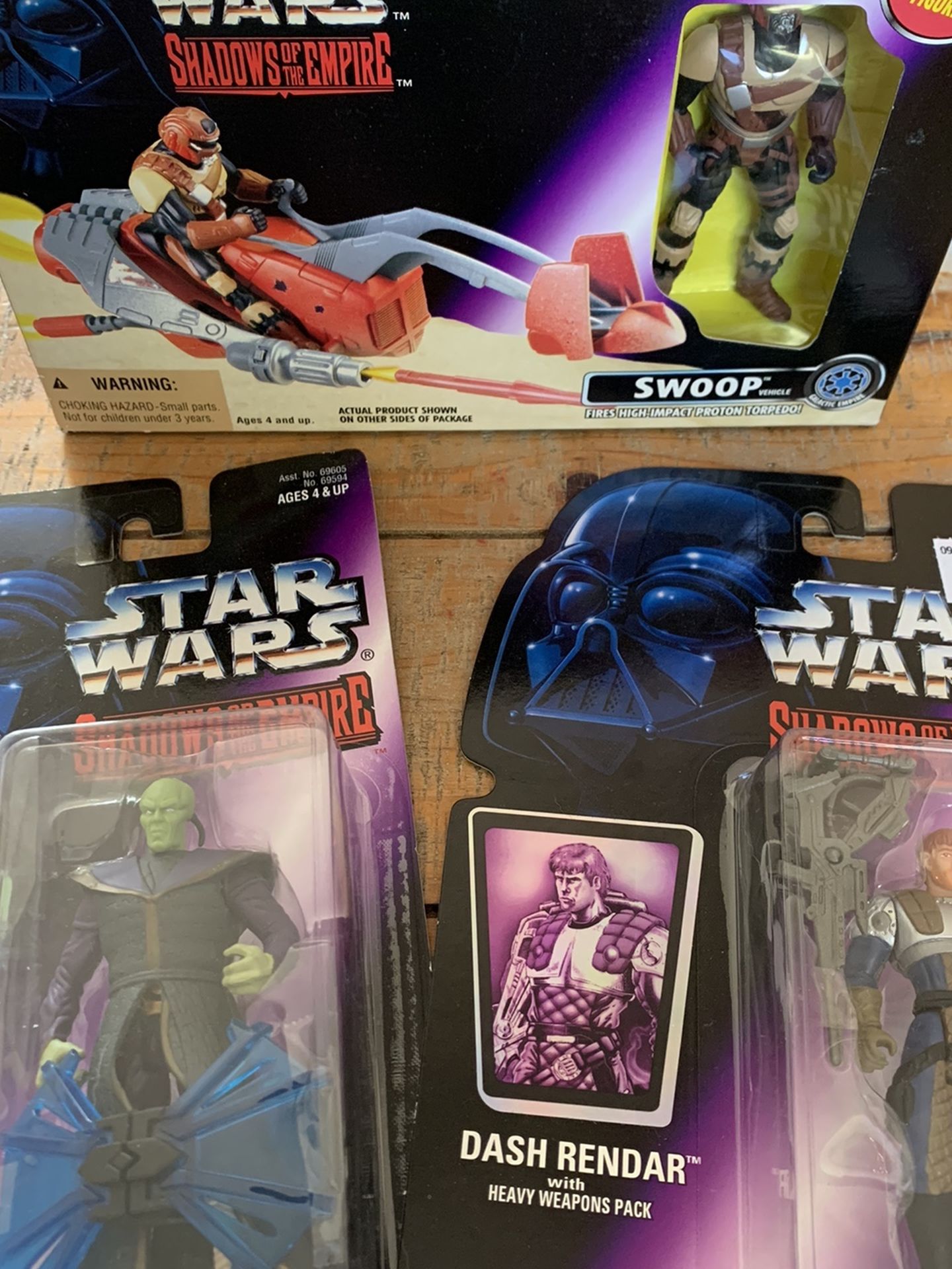 Lot of 1996 Star Wars Shadows Of The Empire action figures and vehicle including: Dash Rendar w/ Heavy Weapons Pack Prince Xizor w/ Energy Blade Shields & Swoop (vehicle) w/ Swoop Trooper / fires high-impact proton torpedo! All items are brand new in the original box. All boxes are in perfect condition.