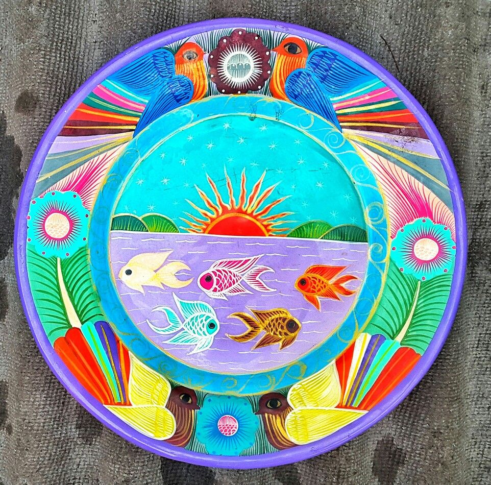 Huge 16" Mexican folk art pottery bright polychromatic charger or wall plaque
