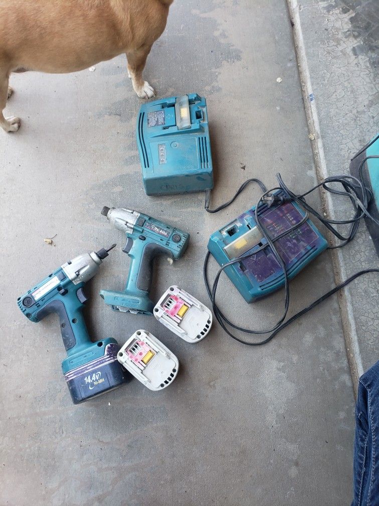 4 batteries total 2 drills 1 impact 3 chargers All 14.4 volts