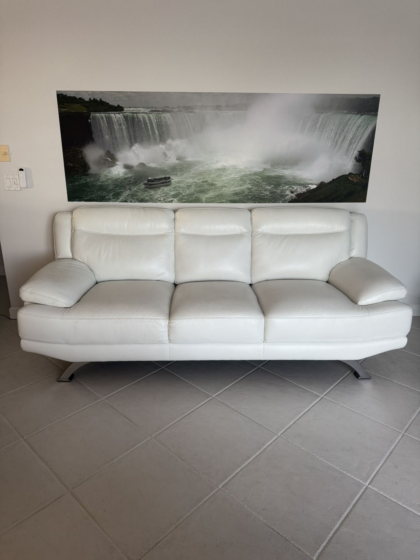 This is a sofa and loveseat covered in white leather in impeccable condition. It stands on chrome curved legs. The sofa dimensions are 90”L x 35”D x 37”H. The loveseat is 68”L x 35”D x 37”H. Pick up in Port Saint Lucie only.