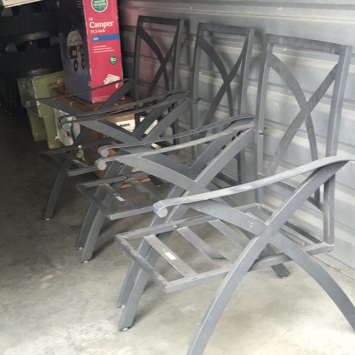 For your cushions inside 18.1/4”W x 20.1/4”D Back of seat to floor 35”H Seat to floor 14”H See 3 nice strong sturdy metal chairs.