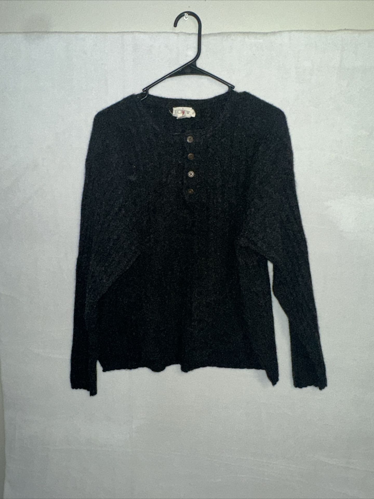 J Crew 1/4 Button Sweater! Women’s size XL. Black in color. 100% lambswool material. Vintage. Chest size- 24 inches (arm pit to arm pit) Length- 25 inches (top shoulder hem to bottom of sweater) Asking: $35.00 to ship OR $15.00 to pick up. Pick up on Battleground OR Randleman Road.