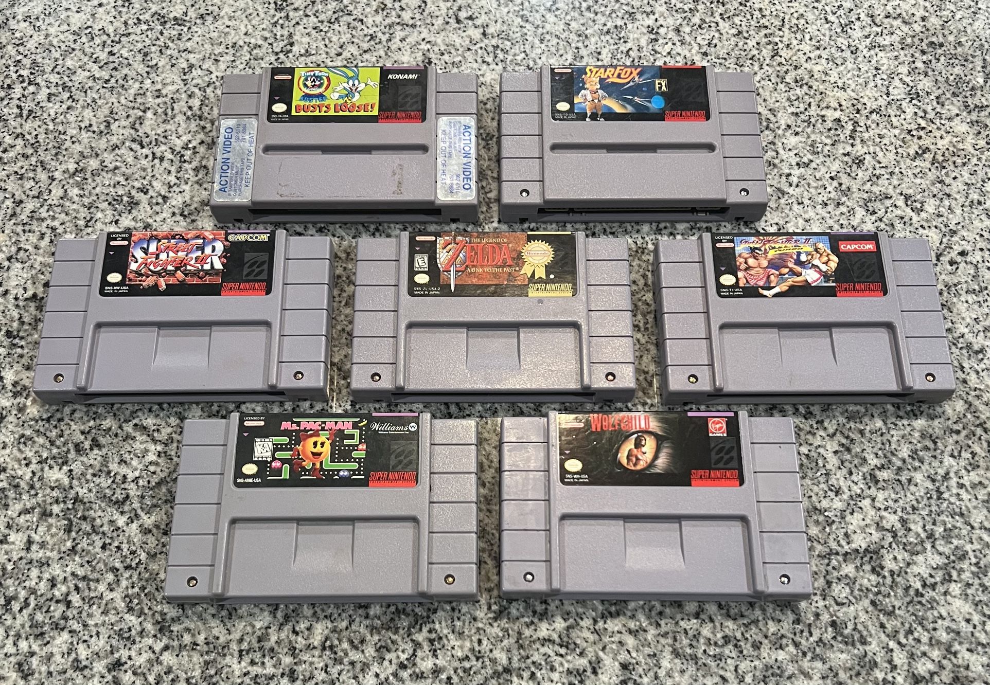 Street Fighter $20 Street Fighter Turbo $20 Wolfchild $25 Tiny Toons $15 Ms Pac Man $15 Star fox $20 A Legend of Zelda $40 Can sell as a bundle or individually. Firm on price. Pick up only.