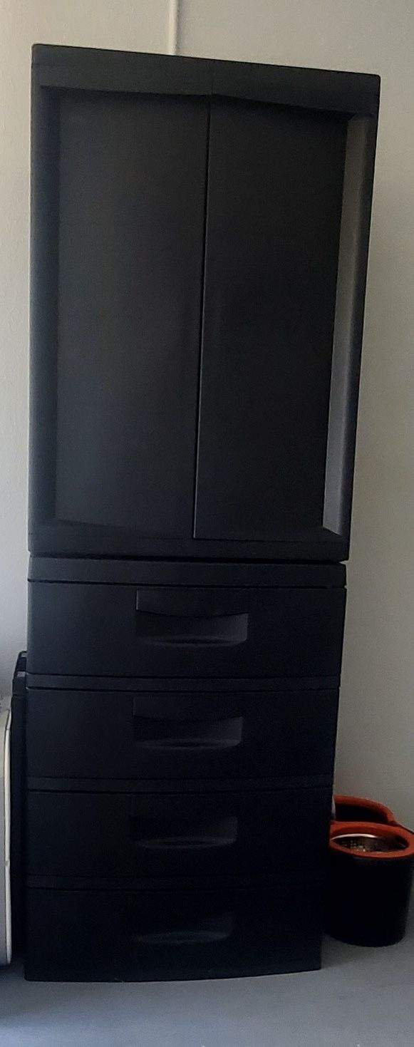 Selling a plastic storage cabinet, bottom has 5 draws and top cabinet with 2 doors and inside has 2 shelves. Paid $140 but asking $100 or best offer. Local pick up only and cash only.
