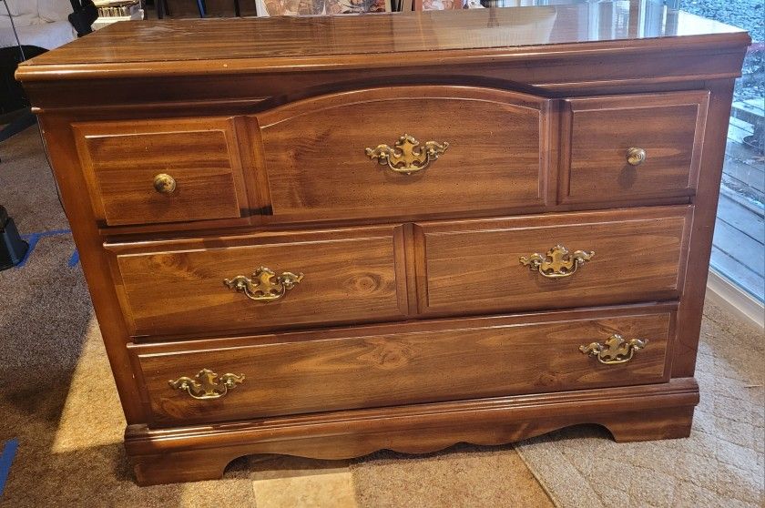BASSETT Furniture 3 Drawer Dresser Made of a water-resistant pressed laminated fiberboard with a simulated woodgrain. The drawer interior is made of solid wood. It looks a little dated, but I think it would look great if the handles were replaced with something more modern. It's higher quality than most other manufactured wood furniture. Moisture, even left on the surface for a period of time, does not absorb and does not leave rings or stains. There are a few scratches and dings, especially on the left side, but they're not very noticeable, and the dresser is in great condition overall. 18"D x 42"W x 31"H Pick-up only, all sales are final, price is negotiable.