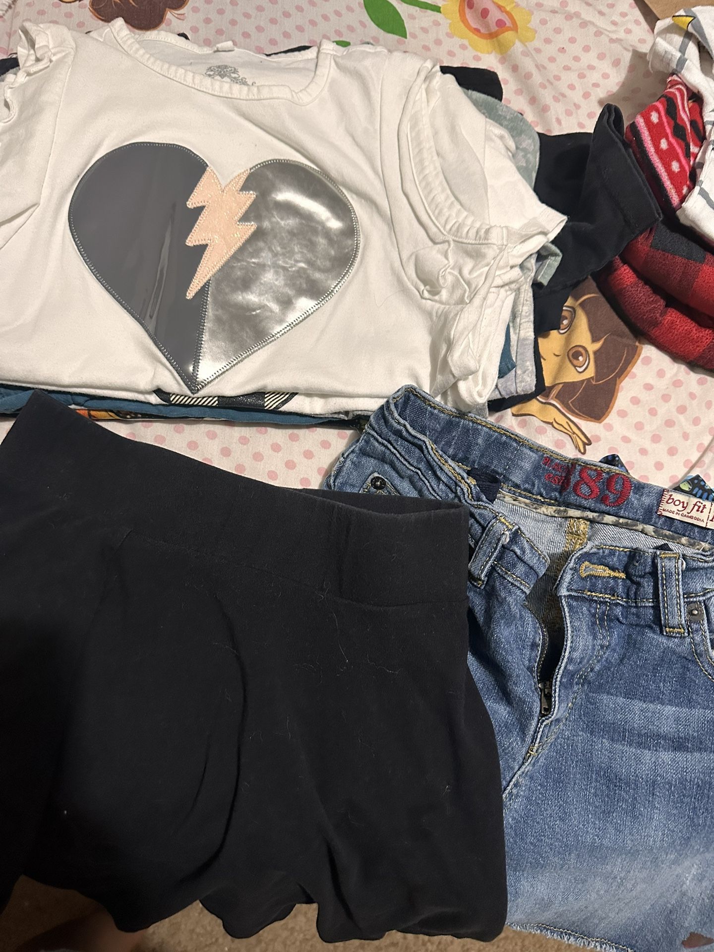 Girl clothes size 10. 1 sweat pants 1 jean shorts has paint stain, 1 skirt, couple pjs 1 swim suit Shirts and few tank tops.