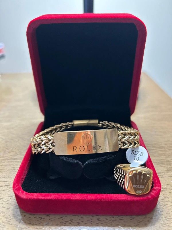 Classic stainless steel rolex ring and bracelet. Both come with full golden colors. Bracelet has a magnetic clasp for easy opening and secure locking. Rings in 8,9,and 10 sizes are available.