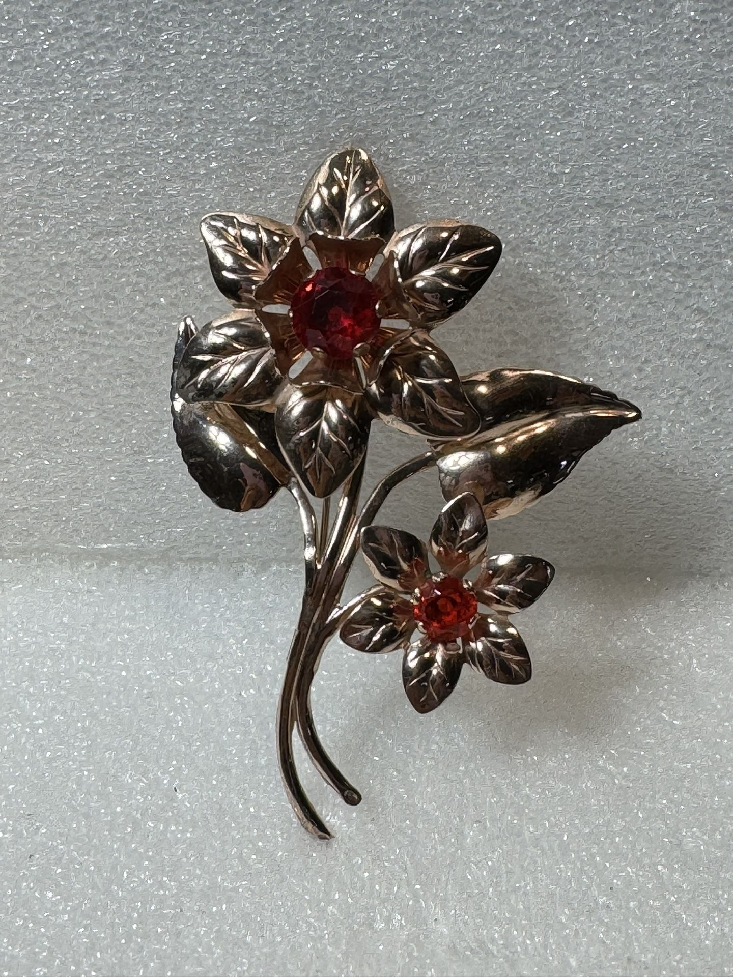 Size: 3.75” long x 2.5” wide (widest area) x .52” thick Style: vintage 3 dimensional rose gold over sterling accentuated with faceted red crystals large brooch. Stamp: Sterling Condition: may have some toning and oxidation in the crevices and in other areas. Note: collectible, fashionable and definitely elevates your fashion and style. Please inspect each pic for those are important part of item description. Thank you for stopping by.