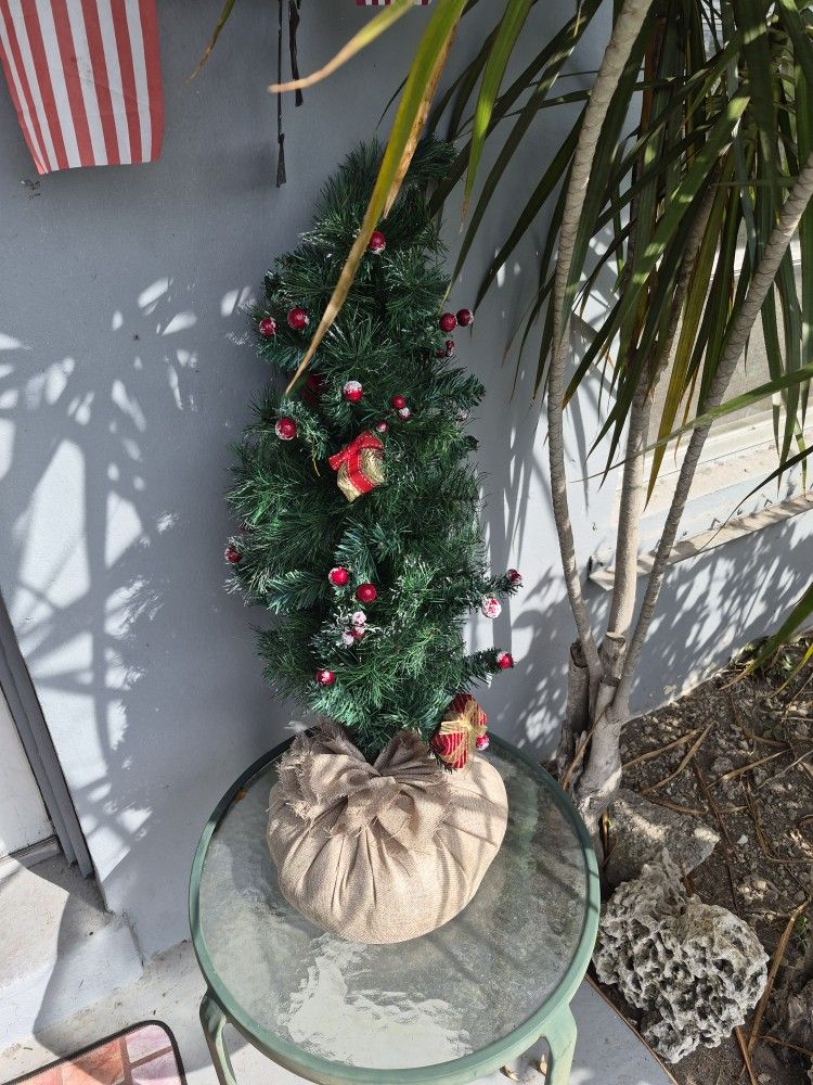 I'm selling this 3 ft tree Over all in good shape. It leans a little.but still ok. Added lights too. I have other Christmas stuff on here too along with other household item and more.