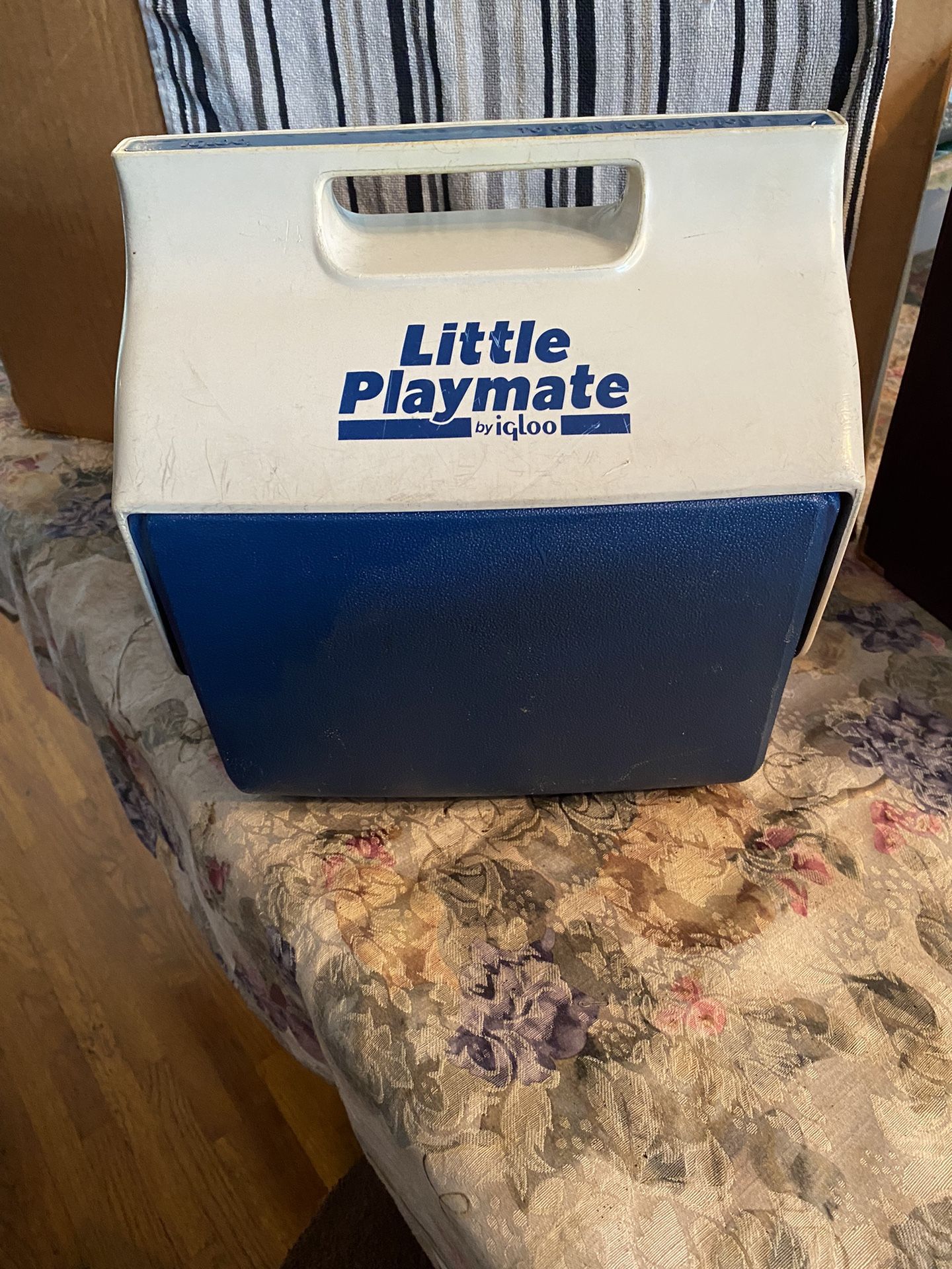 Blue and White sturdy case. 6 - cans or bottles capacity. Used but in great shape. No cracks or damage.