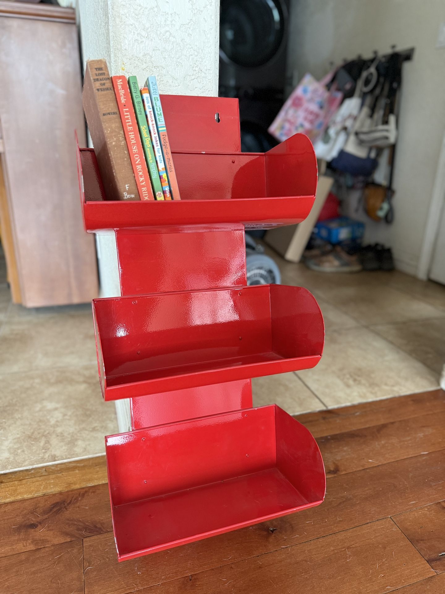 30Lx13Wx7D Super cute in my son’s baby room but now he’s getting older, moving on to new decor! Has some very small scuffs but it’s a cute piece as a shelf for books or towels or baby accessories, anything really!