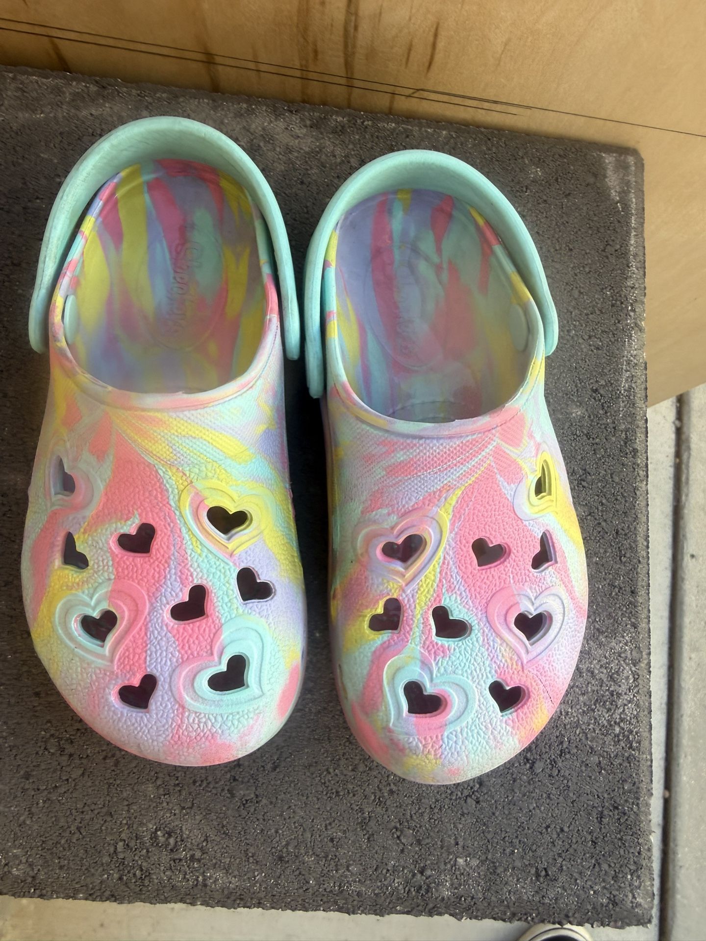 In good conditions Sketchers brand Girls multi color Crocs size 11 USA Pick up and Cash Only Pick up area 92503 or 92870 zip codes .