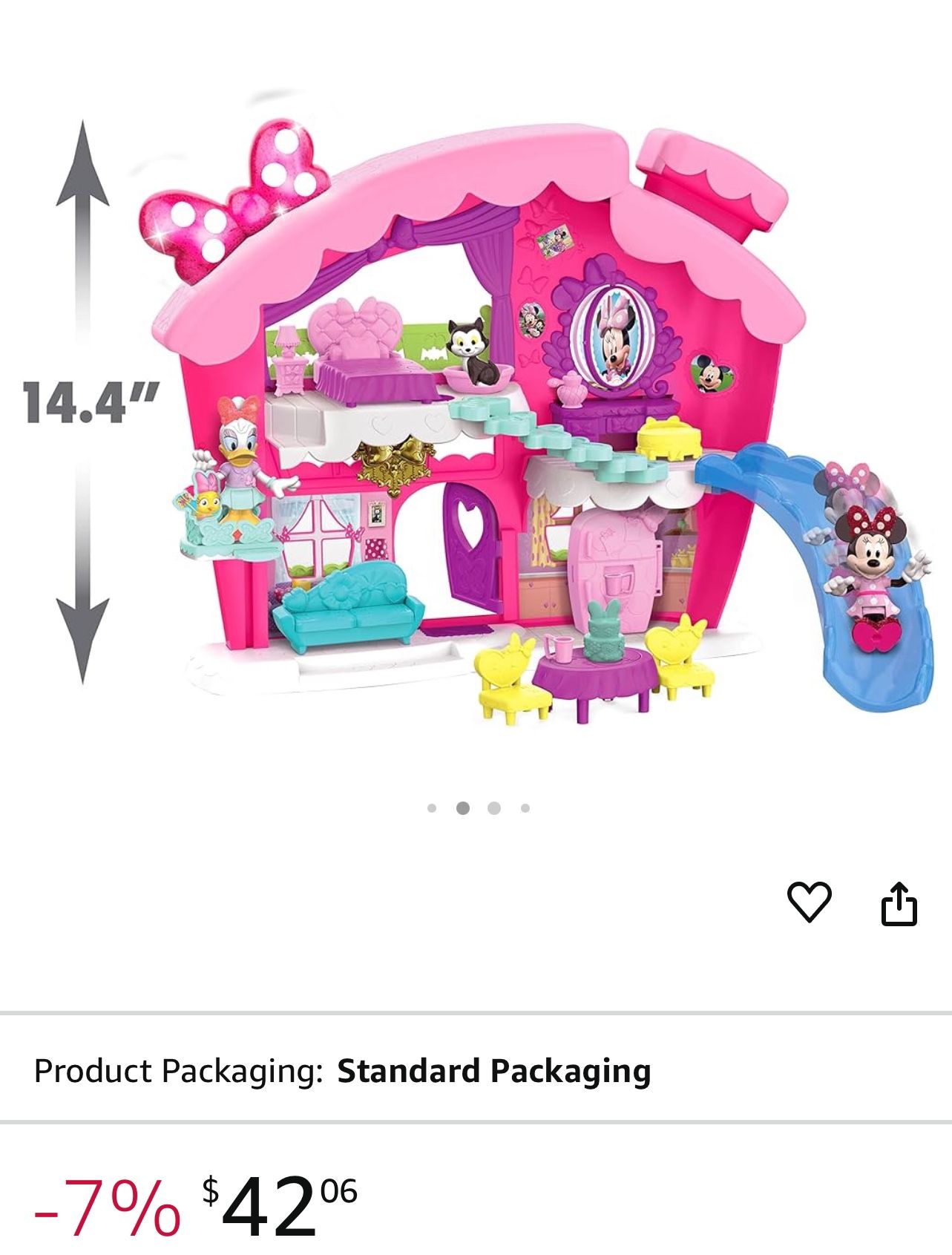 Join Disney Junior's Minnie Mouse in her fantastic Bowfabulous Home! This two-level, two-sided playset features a twinkling multi-colored light and sounds bow. Minnie fans will love using the furniture to customize and decorate her home. There are so many surprises inside!
