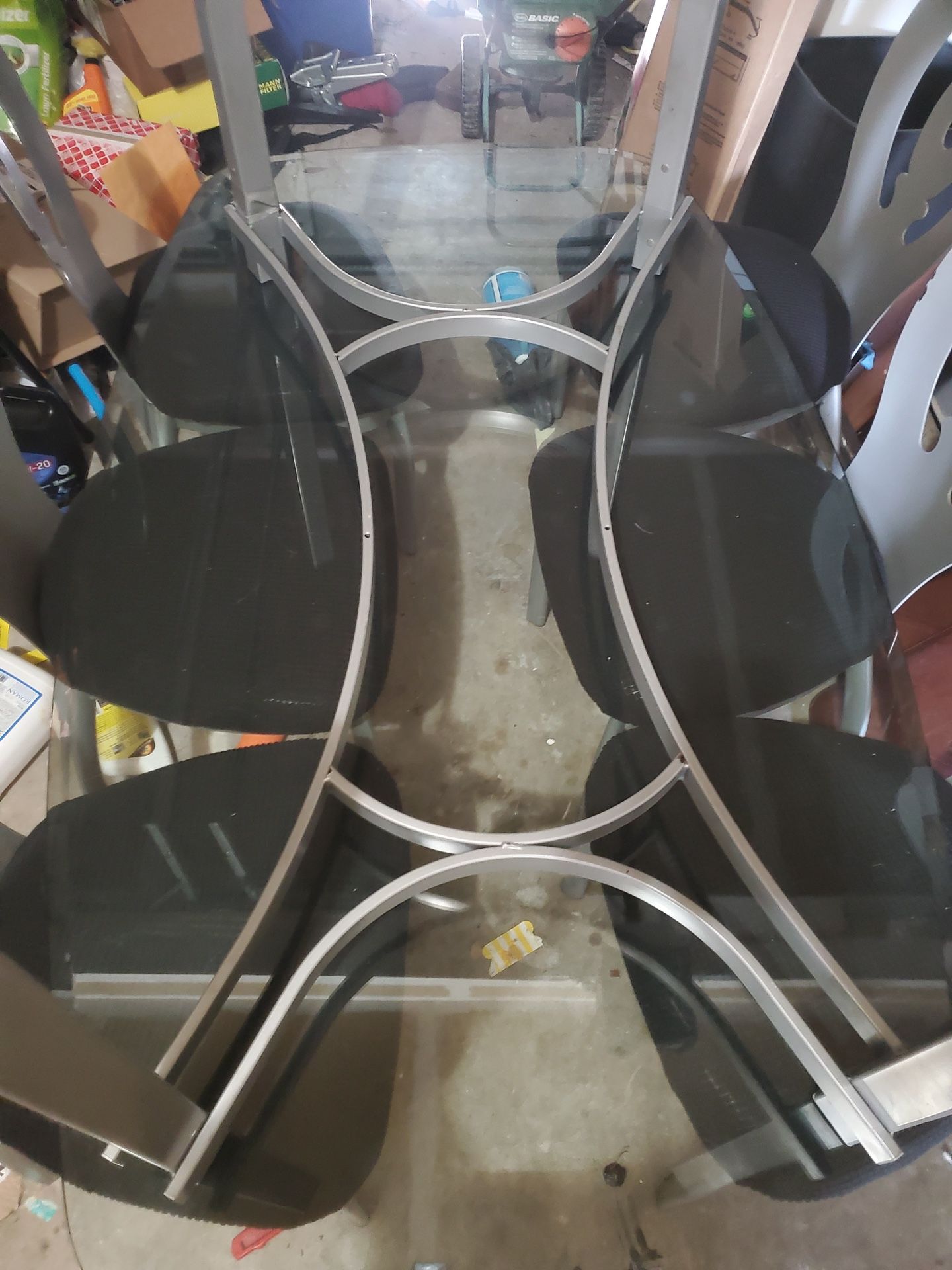 Glass and steel table. Leather/cloth steel chairs. Can be painted and leather on chairs can be changed. Normal wear. Table’s on leg is loose but fixable. A very good deal for those want to have long lasting durable dinning table set!