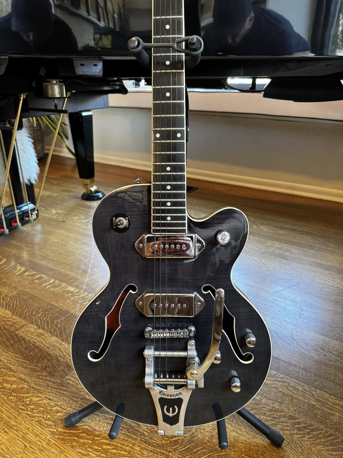 Great rock guitar! In BlackvPearl (limited edition)Sounds and plays (sings) wonderfully. Have to reduce guitars and now some of my favorites have to go. Reverb review says: The Epiphone Wildkat is a compact, semi-hollow body electric guitar renowned for its vintage style, featuring P-90 pickups, a Bigsby vibrato, and a Mahogany body with a maple top. It offers a lightweight, comfortable playing experience with a punchy, versatile tone ranging from warm blues to raw rock, often described as a high-value, "bang for your buck" instrument. Pros: Excellent value for money. Unique, eye-catching vintage, "head-turner" design. Versatile, punchy tone. Lightweight and comfortable. Cons: The Bigsby can make string changes and tuning challenging. (I don’t agree it’s no big deal!) Some users find the P-90s can get muddy. Slightly top-heavy due to the headstock. Verdict The Epiphone Wildkat is a highly recommended, distinctive, and affordable choice for players wanting a versatile semi-hollow, especially those into blues, rockabilly, and indie rock. I play contemporary Christian music and live the tone. Gibson, gretsch, Taylor, Martin, fender, Alvarez, Ibanez, harmony, Rickenbacher, ovation, Ernie Ball, Breedlove, Yamaha,