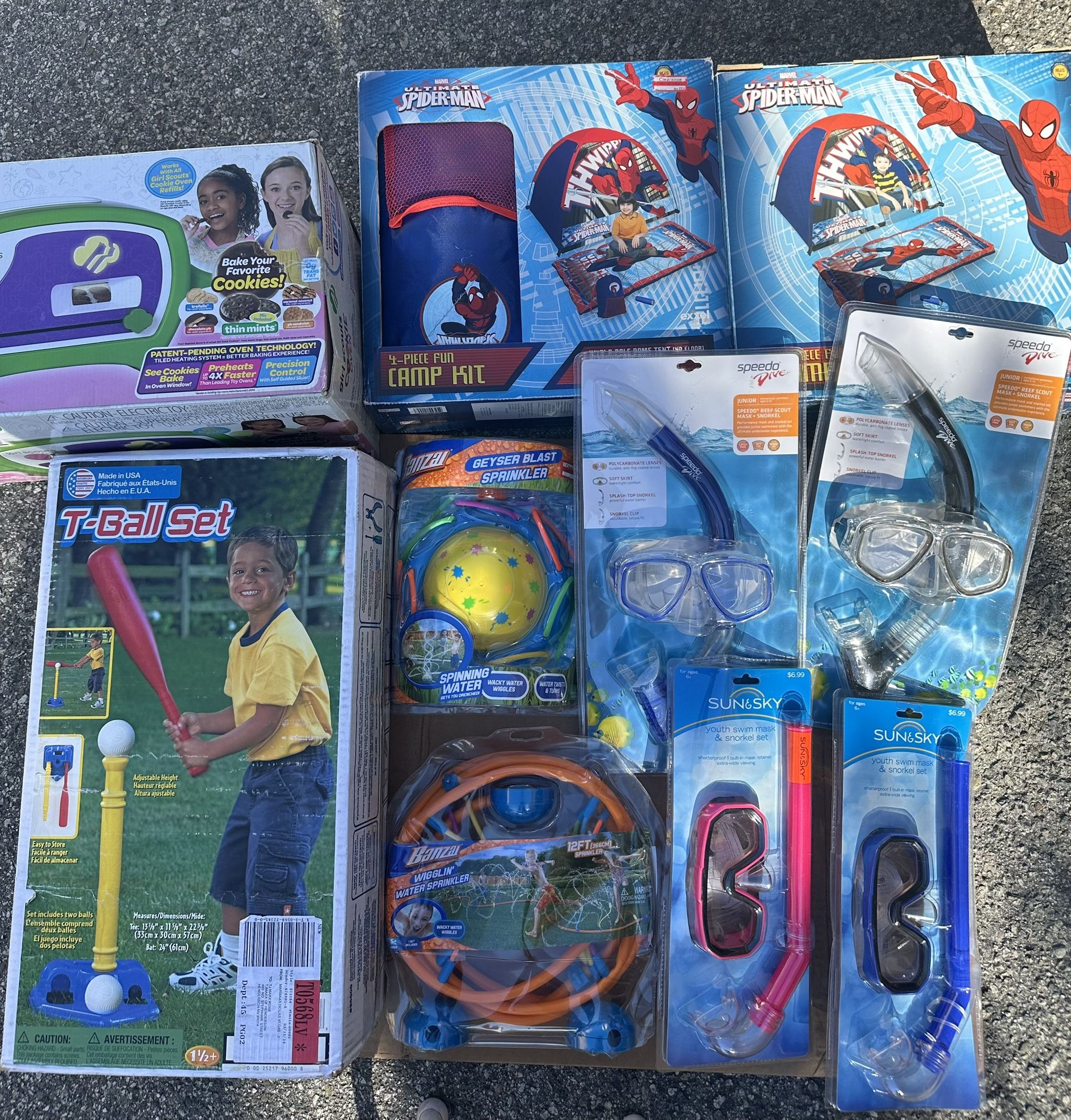 10 kids items new and open used once Girl Scout baking oven 8+ T ball set 2+ 2 camp sets 4+ 4 Speedo snorkel sets 6-14 yrs 2 Banza water sprinkler 3+