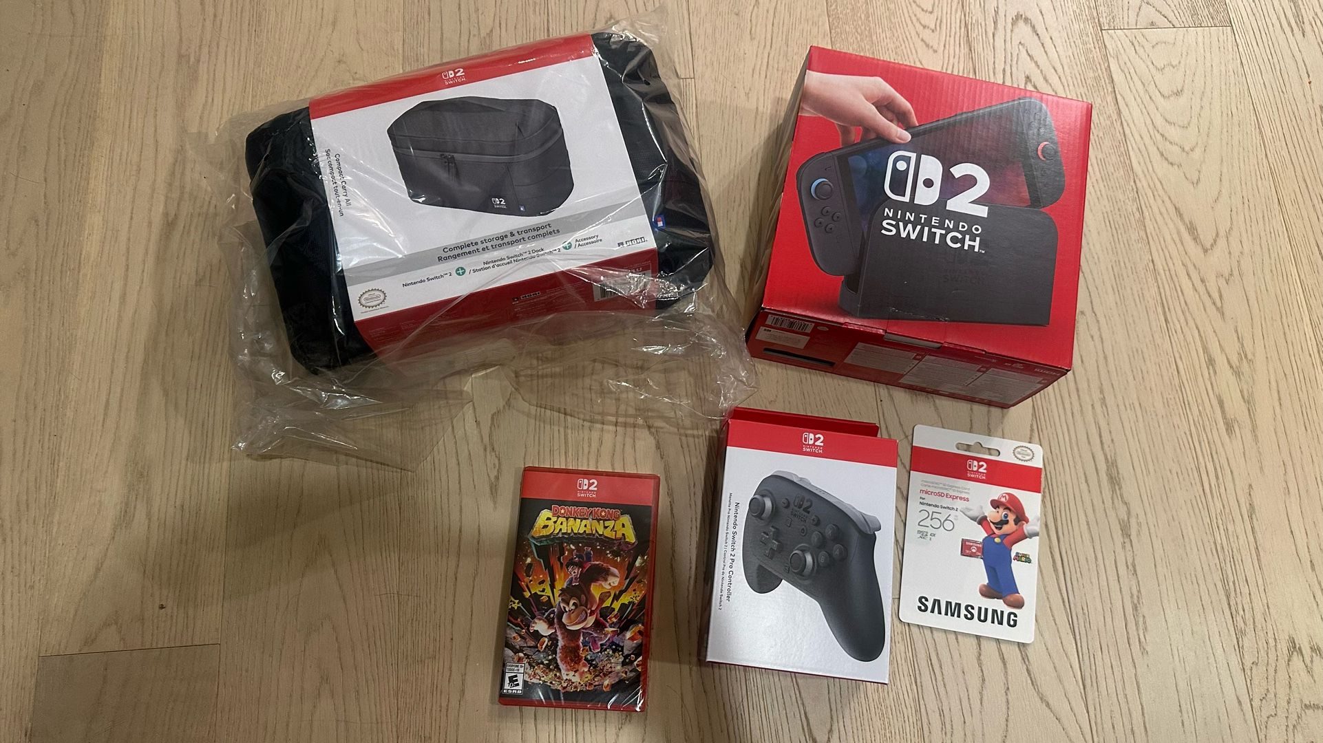 New/unopened: comes with switch 2, case, donkey Kong bonanza, controller, and 256 gb micro SD card