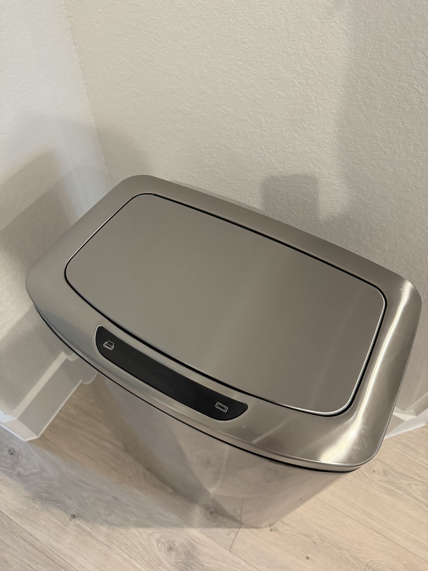 Free- Stainless Touchless Open Trash Can It is dented in the front. The dent may come out with a little TLC.