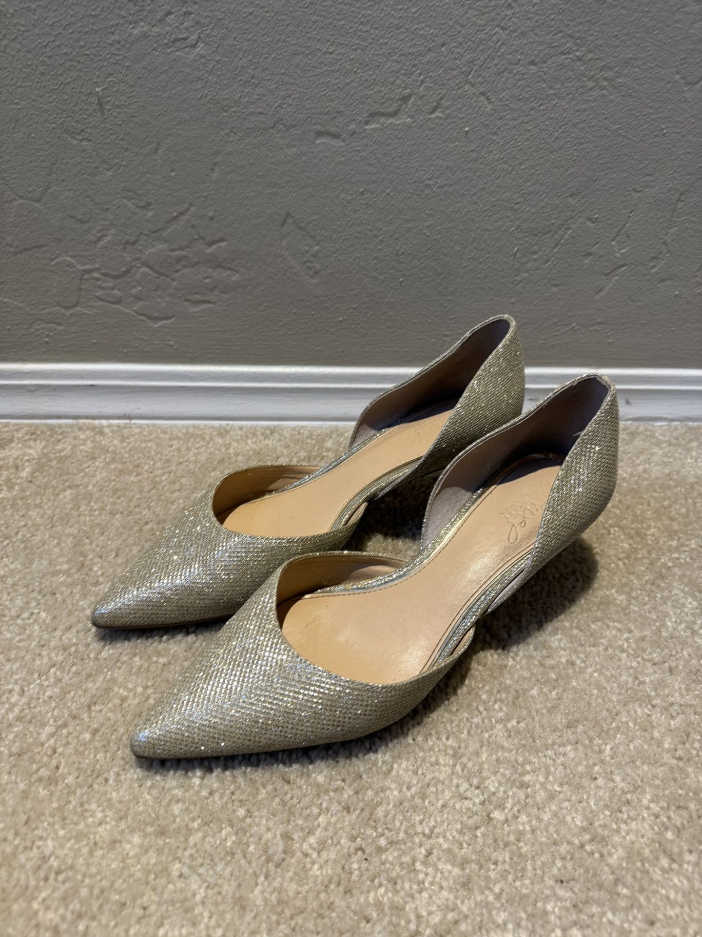 Like NEW Jewel Badgley Mischka Dotty glitter d'Orsay kitten heel pump, size 8.5. Retail price is $100. Pet/smoke-free home.