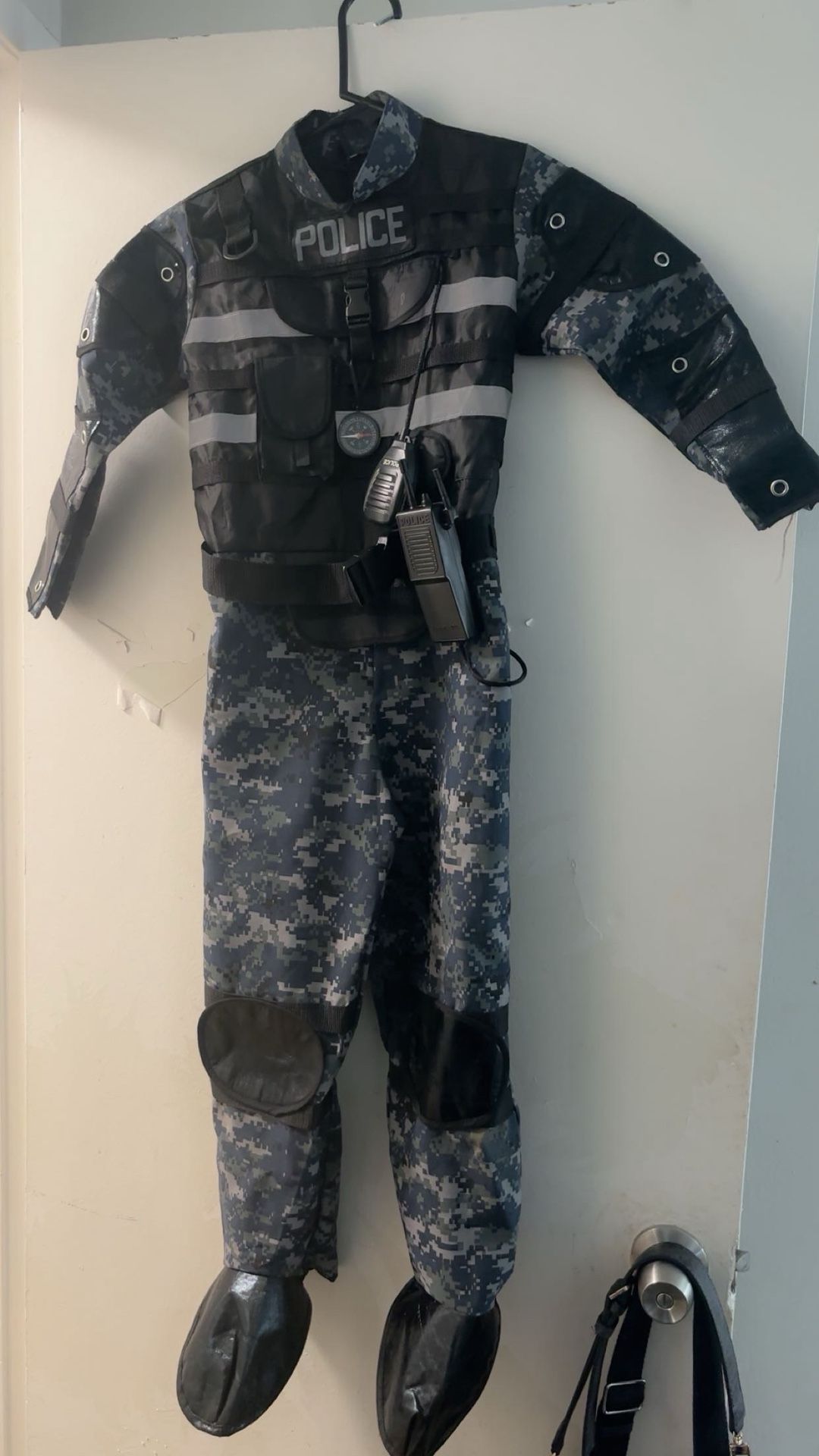 Police swat camouflage costume size 8 used ones in good condition no rips no stains. All the pieces are there. It’s a jumpsuit that has Velcro in the back.
