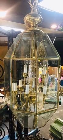 Vintage Octagon and Decagon Beveled Foyer Glass and Brass Chandelier Lamp