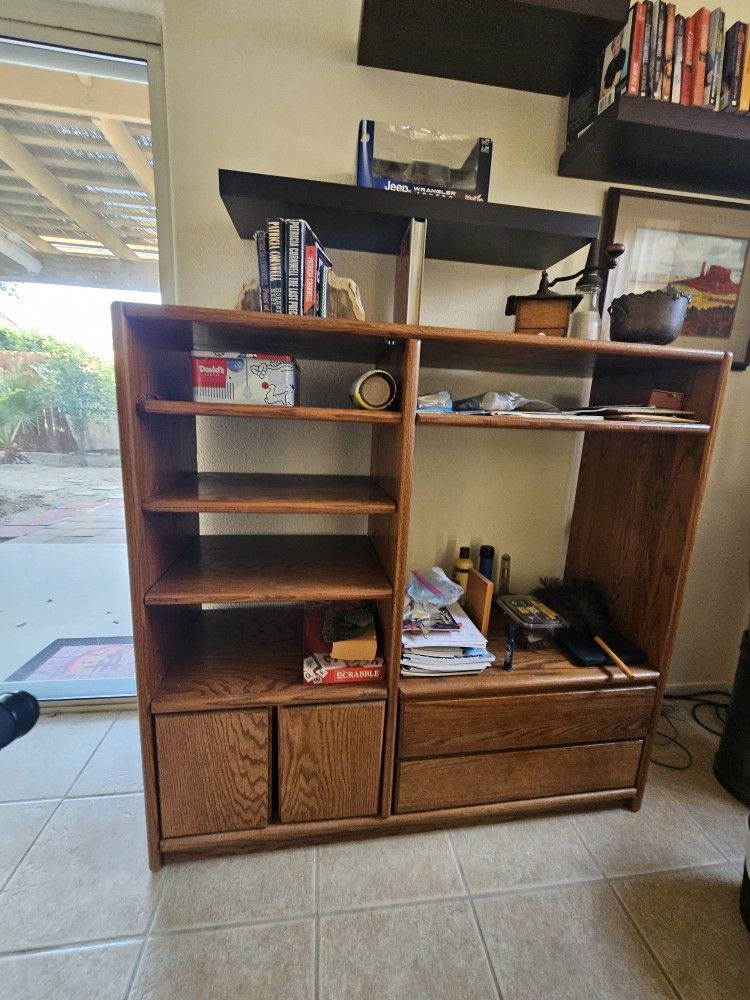 Oak wood, 2 big drawers,and shelves.