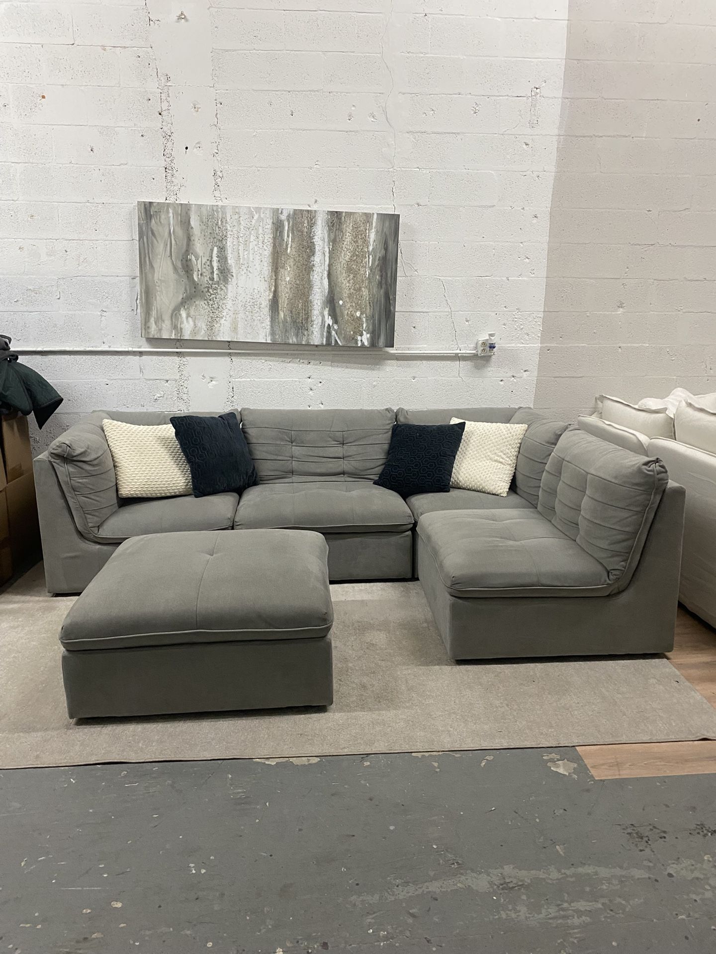 120 inch wide 86 inch chaise 5 pc set with ottoman. Pre owned. Must pick up. Perfect shape. Comfortable.