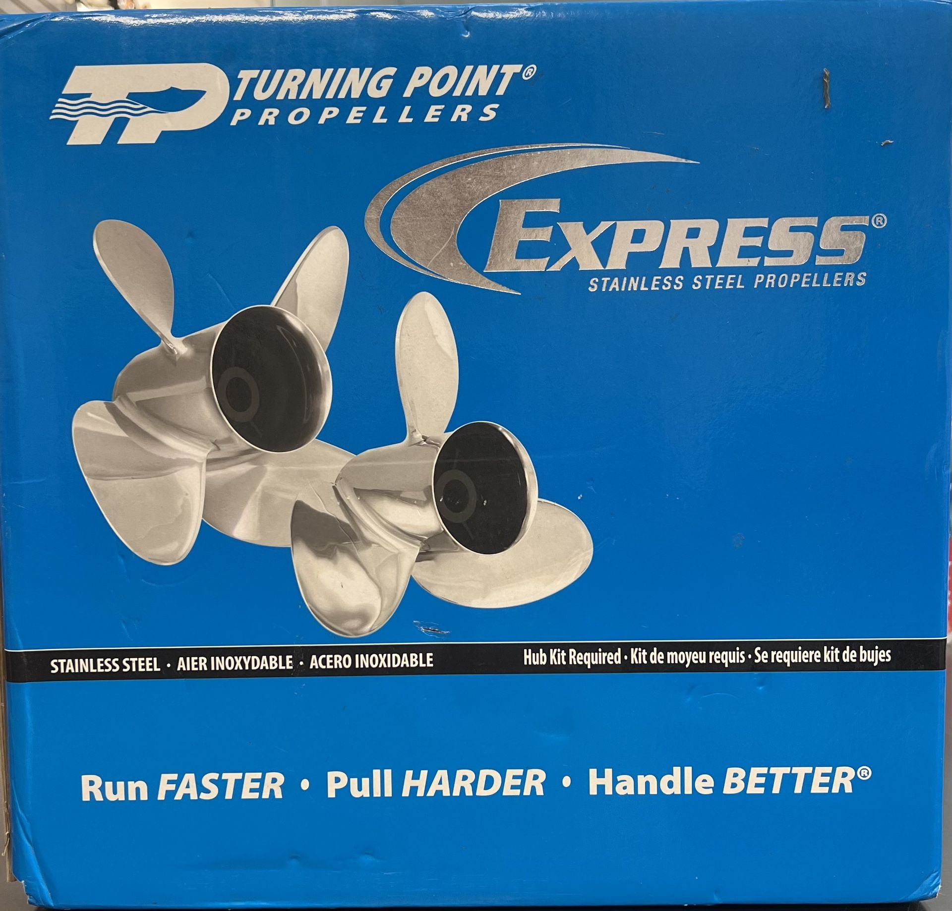 Turning Point Express Mach4 RH SS Propeller EX1/EX2-1409-4 4-Blade 14" x 9 P Express® Mach4™ - Right Hand - Stainless Steel Propeller - EX1/EX2-1409-4 - 4-Blade - 14" x 9 Pitch The Prop that put the “four” in Perfourmance! Turning Point’s Four Blade revolutionized the propeller market when it was introduced. No one had ever produced a state-of-the-art Swept Cleaver design for 40-150hp applications. These props re-wrote the rules, proving that you can run a four blade that has unprecedented hole shot, handling, and rough water stability without the top-end speed loss you experience with other manufacturers’ propellers. These Turning Point props also produced up to 46% more reverse thrust than other comparable designs in recent tests. Now manufactured in our Industry leading TP17 stainless, the Express Mach4 series is perfect for any application that demands enhanced acceleration, cornering, and load carrying capabilities. This prop series is ideally suited for watersports, sterndrive boats, tri-toons, bay boats, and any vessel that can use stern lift. It is our best upgrade of older stainless designs from the 70’s, 80’s, 90’s, and ’00’s, and will outrun most newer props, including five blade ski props. Proprietary Stainless Steel, TP17™ Formulated to meet the exacting requirements of the New Express Mach3 and Mach4 designs. 20% higher chromium content than the competition - more shine, better corrosion resistance. Almost 250% Stronger and 5X more durable than run-of-the-mill stainless steel. This new material allows Turning Point's Engineers and Designers the freedom to produce radical new designs that will help you wring the most performance out of your boat. Large Free Flowing Exhaust Ports Turning Point's Propeller Housings have massive Exhaust flow pathways. Their Propellers have 40% more exhaust flow Area versus competitive product. More exhaust flow and less backpressure can generate more horsepower. Like headers for your boat. Turning Point manufactures Express propellers to fit 9.9(bigfoot)-300+hp Evinrude®, Force®, Honda®, Johnson®, Mariner®, Mercruiser®, Mercury®, Nissan®, OMC®, Parsun®, Suzuki®, Tohatsu®, Volvo® Penta®, and Yamaha® Outboards and Sterndrives. Choose one of our Lifetime Warranty MasterGuard Installation Kits to fit your engine, then choose the propeller that matches your boating requirements. There are 3 and 4 blade, left and right rotation prop models with a variety of diameter and pitch options available for almost all boat types. Turning Point's Props Run Faster, Pull Harder, and Handle Better. Note: A Hub Kit is required for installation of this propeller. See the Turning Point Selection Chart or the Prop Wizard™ for hub kit selection.
