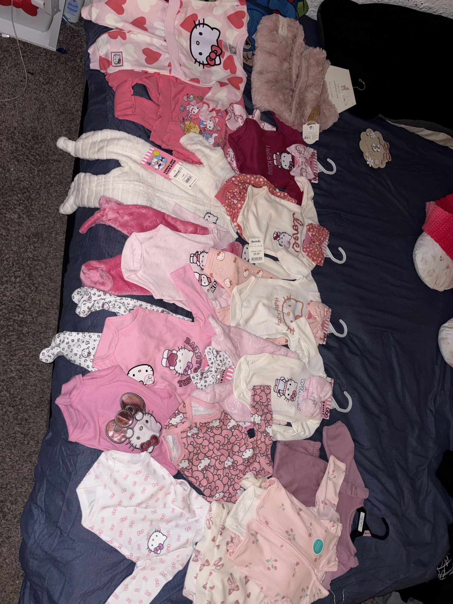 Have 9 hello kitty baby outfits brand new with tags still, 8 are 3months 1 is 3/6 months, 3 baby girl outfits size 0/3 months 1 swaddle & 3 hello kitty long sleeve onesies size 3months used. 90 for all. Price is firm.