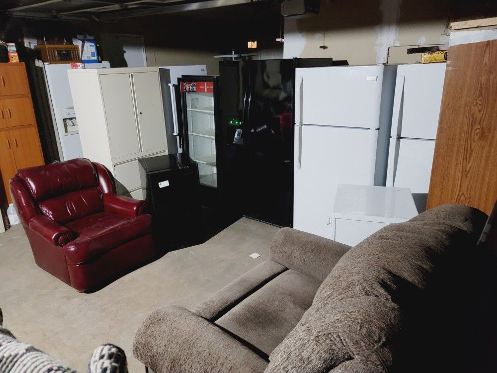 If interested in any contact me. Side by side fridge Top bottom fridge Small black fridge Small electric dryer Coca Cola cooler Large upright freezer Brown oversized chair Red leather chair Large bookshelf Large filing cabinet