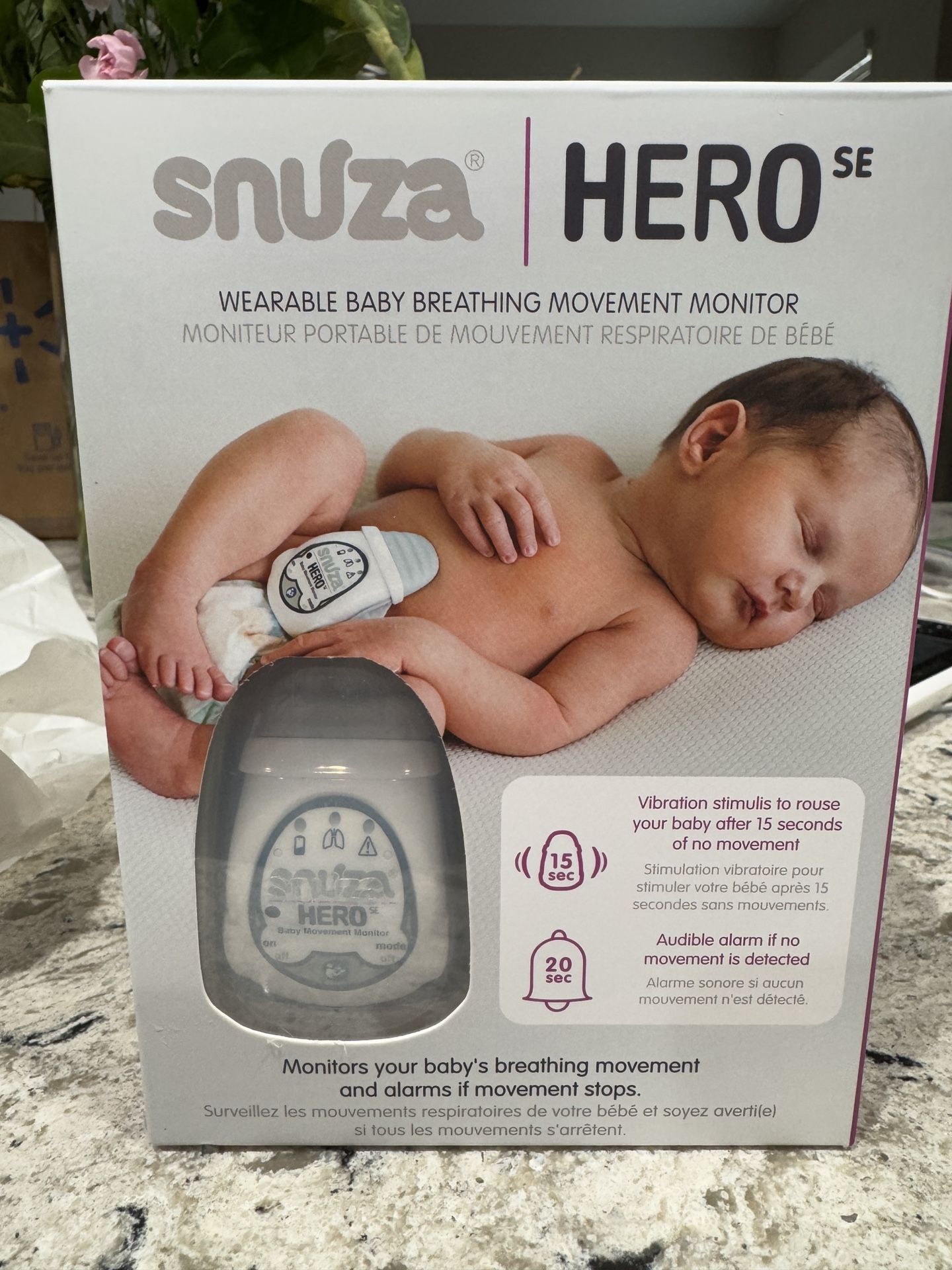 Snuza Hero baby monitor. Attaches to diaper to monitor baby breathing during sleep for peace of mind. New in box, used only once to test out. Works well but we just didn’t end up using it.