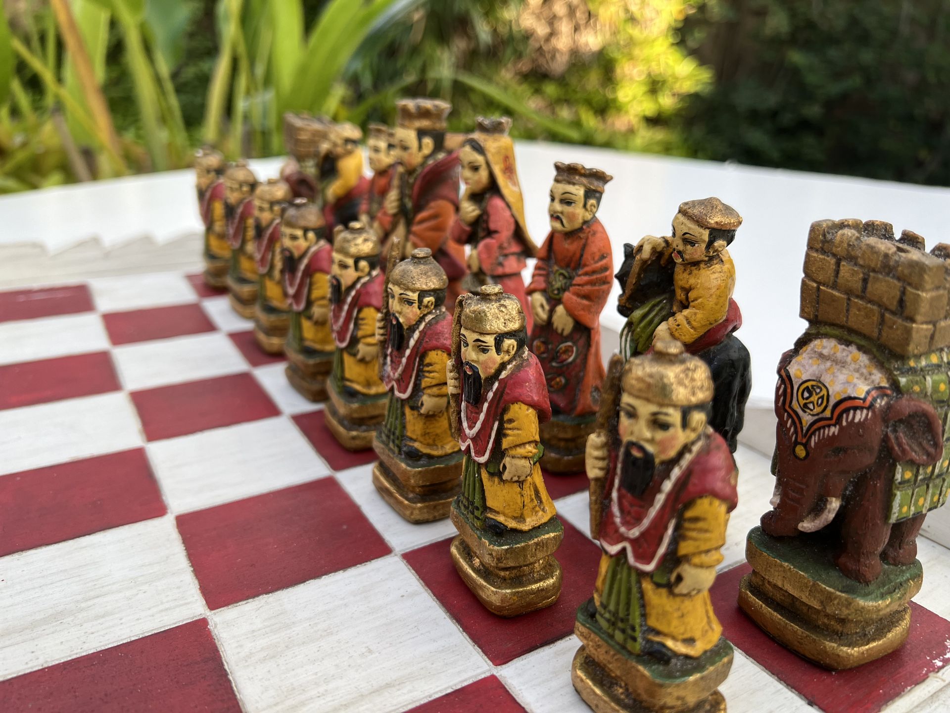 Vintage hand painted chess set with board and hanging display.