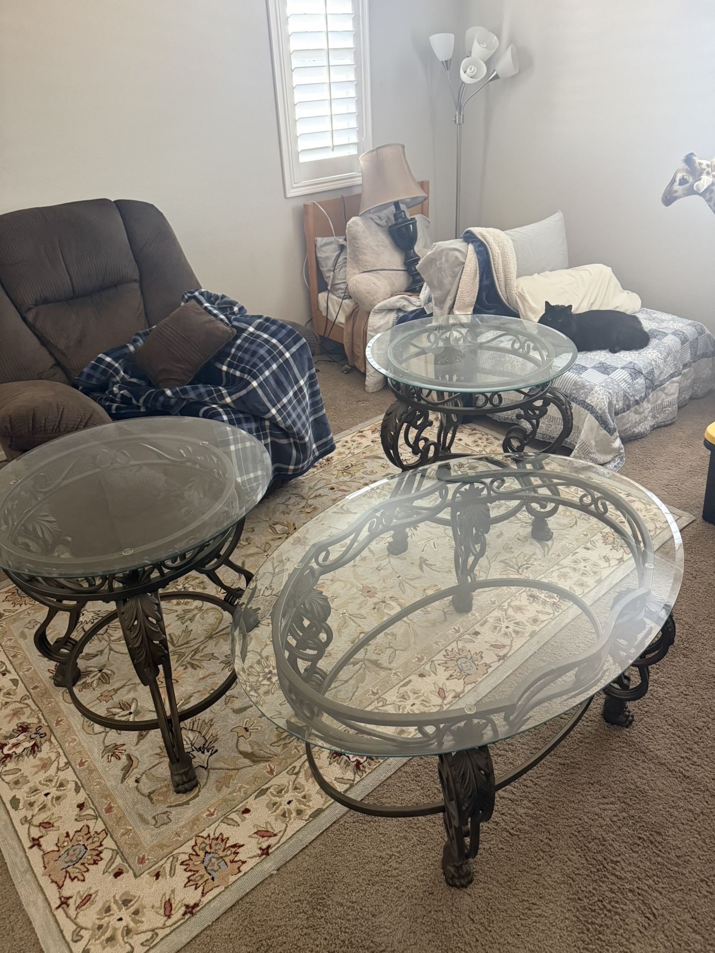 2 side tables 28”round 28”tall 1 main table 48”L x 33”W x 22”T Glass has no chips or cracks Iron frames in good condition as well. Sold as a set .