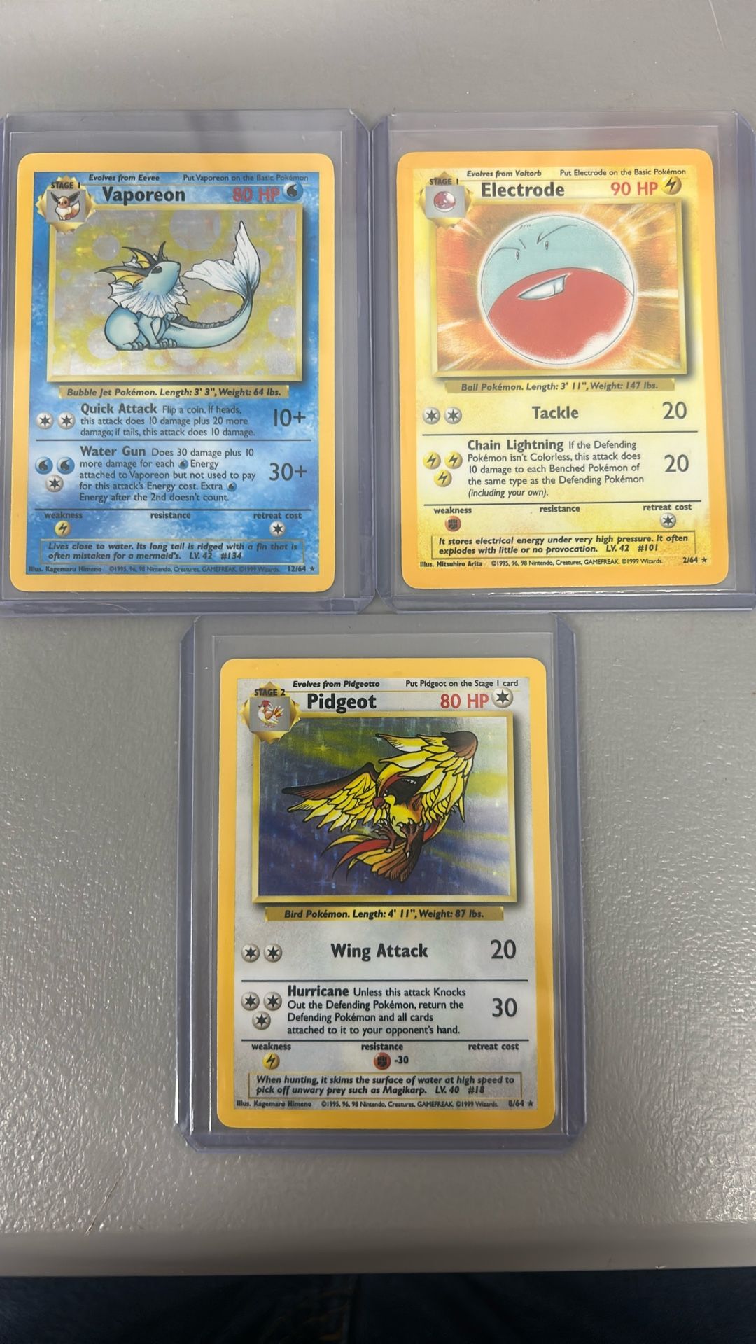 Near mint, No set symbol Vaporeon, Electrode, & Pidgeot. All three in near mint with no scratches, blemishes or abrasions. $100 for all three Open to trades Mainly looking for WOTC, Diamond & Pearl, HeartGold SoulSilver, Black & White, XY promos, and Pop series 1-9 cards. I have about 75% completed but will trade across or partial trade+cash for any card I need. Any trade card you may have that I need I will comp at 100% trade value. Lmk what you have. Worst I can say is no thank you.