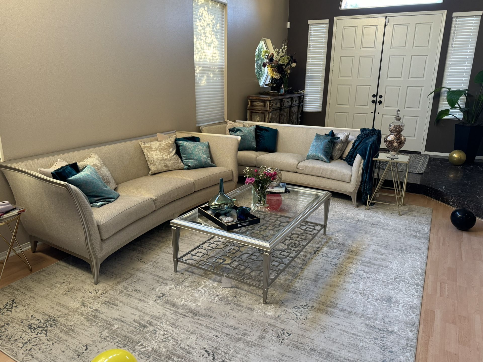 Gorgeous sofas with center table Dimensions length-7ft and depth about 6 ft Best offer accepted