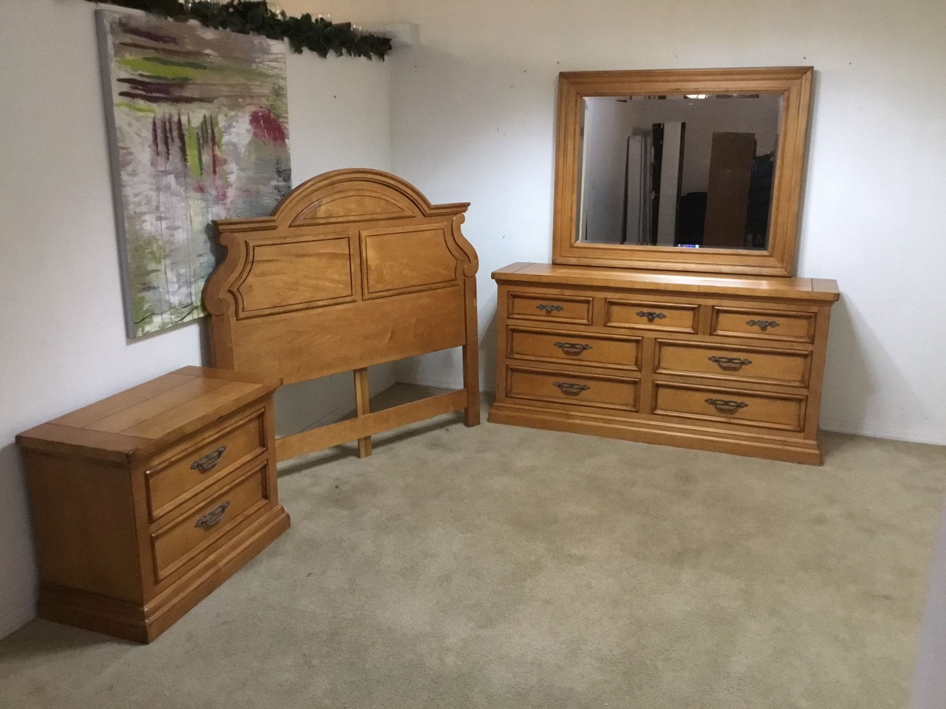 This set is Drexel Heritage. It is made out of thick solid wood, and it is in perfect condition. The dresser is 72” long, 19.5” deep, and 36” tall. The mirror is pretty big. It can used in either direction on the dresser or it can be hung. It has the hardware for both. The nightstand is 36” wide, 18.5” deep, and 27.75” tall. The headboard is 60” tall. It can be used with a metal frame or an adjustable bed.