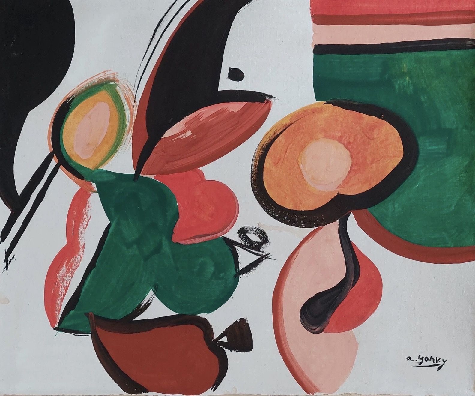 The painting is an abstract expressionist work by Arshile Gorky. While Gorky’s early work reflected a Cubist influence, this piece aligns more closely with his late style from 1943 to 1947, when his art evolved toward bold biomorphic abstraction. During this mature period, Gorky employed luminous colors and organic, interlocking forms that evoke themes of nature, growth, and rebirth. The composition’s fluid shapes—resembling seeds, leaves, and pods—are characteristic of his celebrated series Garden in Sochi and The Plough and the Song. The artist’s signature, “a. gorky,” appears in the lower right corner. I’m selling this as is, I do know have a certificate of authenticity.