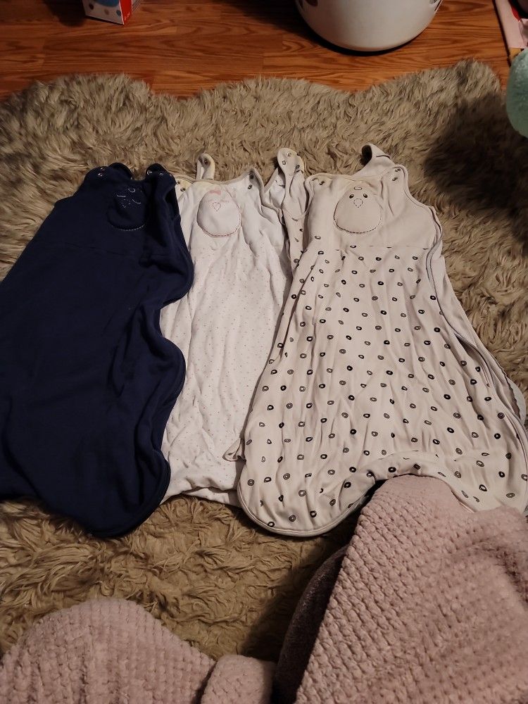 3 super soft "nested bean" sleep sacks. Size medium (for 6-15 months). Reversible for front or back. Actually helps baby sleep longer. 45 a piece on amazon, asking 60 for all 3. One blue, one gray, one white/pink