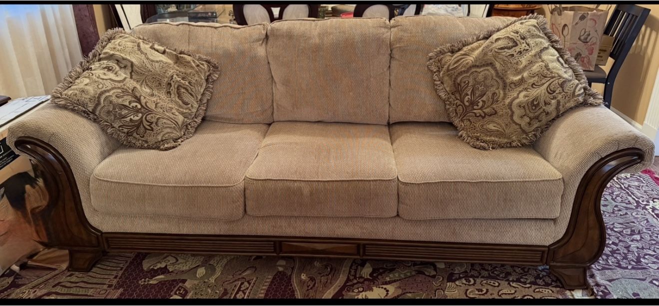 Super comfortable Sofa set, well maintained in a pet-free, no kids and non smoking household. The set is in good condition with no stains. Color Beige Sizes 85 inch by 36 inch 65 inch by 36 inch