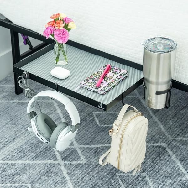 LUXOORYO premium steel bedside shelf in black with removable washable mat, 10" D x 15" W x 2.56" H, includes 2 hooks, cable holder and cup holder, retails for $34.99 Has damage to one corner, shown in photos *No holds unless pre-paid for online, price does not include sales tax*