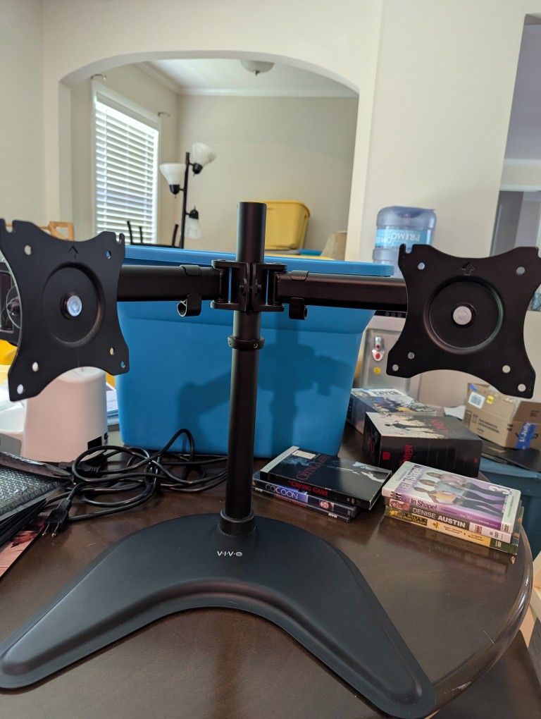 Dual arm monitor stand, supports two displays up to 27" each. All metal. Adjustable.