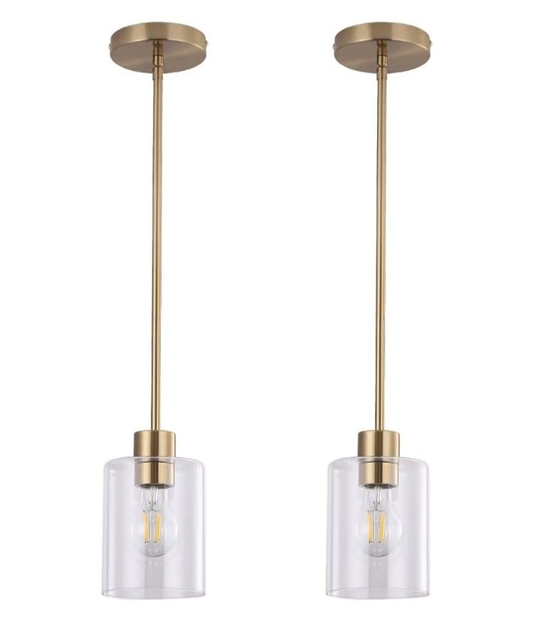 Brass Pendant Lights Kitchen Island, Modern Farmhouse Clear Glass Pendant Light,Gold Light Fixture Kitchen Pendant (Brass 2 Pack stem Rod)