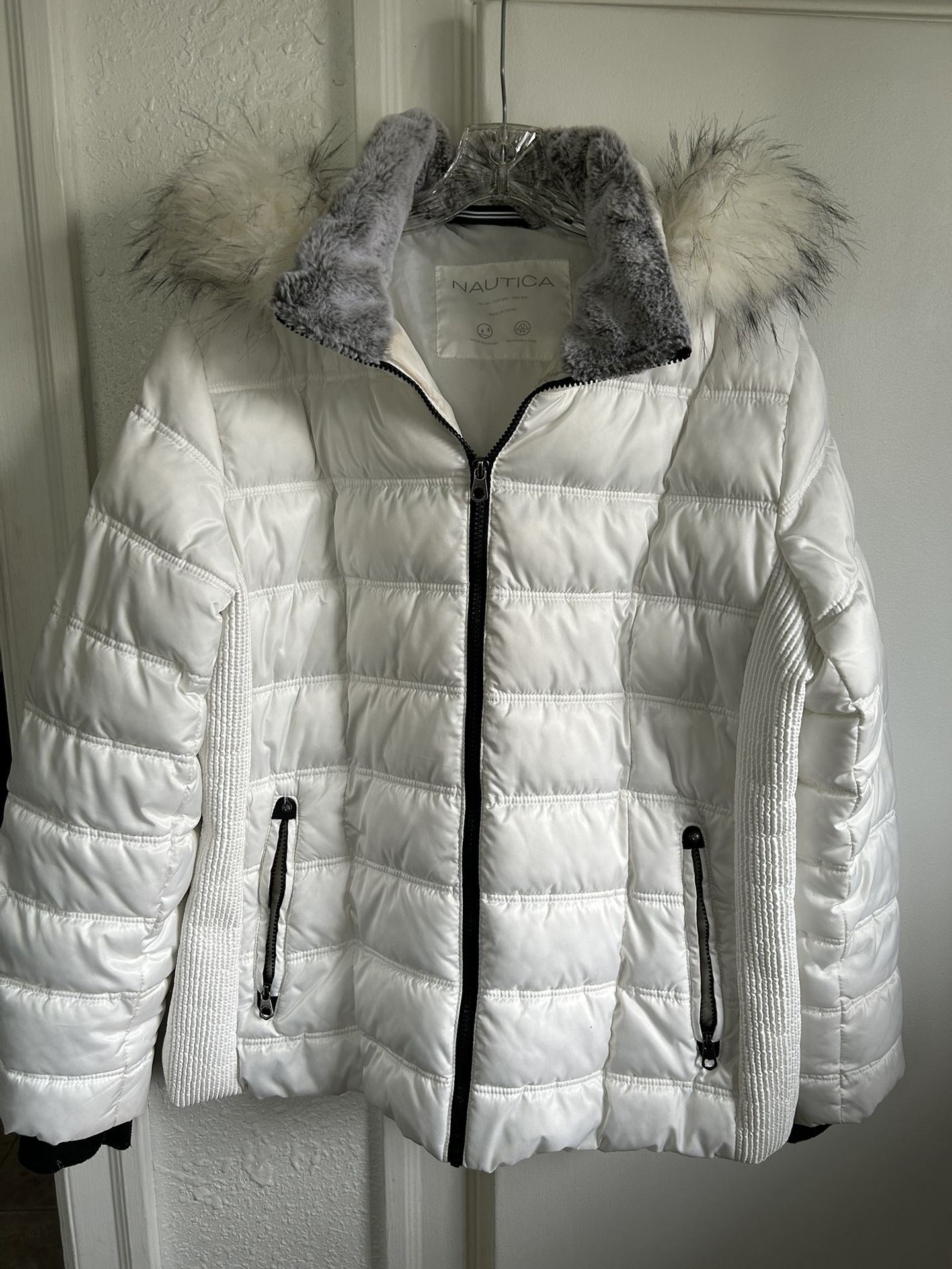 Nautica brand water resistant, detachable hood, white, brush tricot lined pockets, faux fur trim on hood. Warm puffer coat with soft lining on collar and in zip up pockets (with cute nautical silver detail). Faux fur hood.