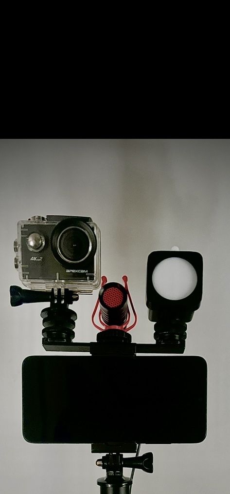 SERIOUS INQUIRIES ONLY. Apex 4k action camera with complete vlogging kit. Water proof, multiple camera mounts. Chest clip, helmet mount. Handle bar ect. Multiple accessories- waterproof underwear camera case, camera remote with wrist strap. 2 batteries with dual quick charging bank. Tripod with telescopic rod to use stationary or as selfie stick. Mirfak microphone plus additional clip on mic for shirt collar. Mirfak moin 1 fill light with smartphone app to operate, includes light filters.