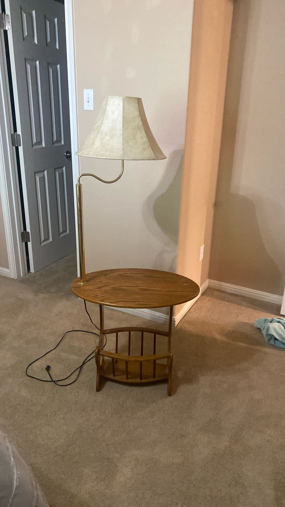Unique piece of furniture that has a built-in lamp on the table with room below for storage. 14”x21” Surface area. $25