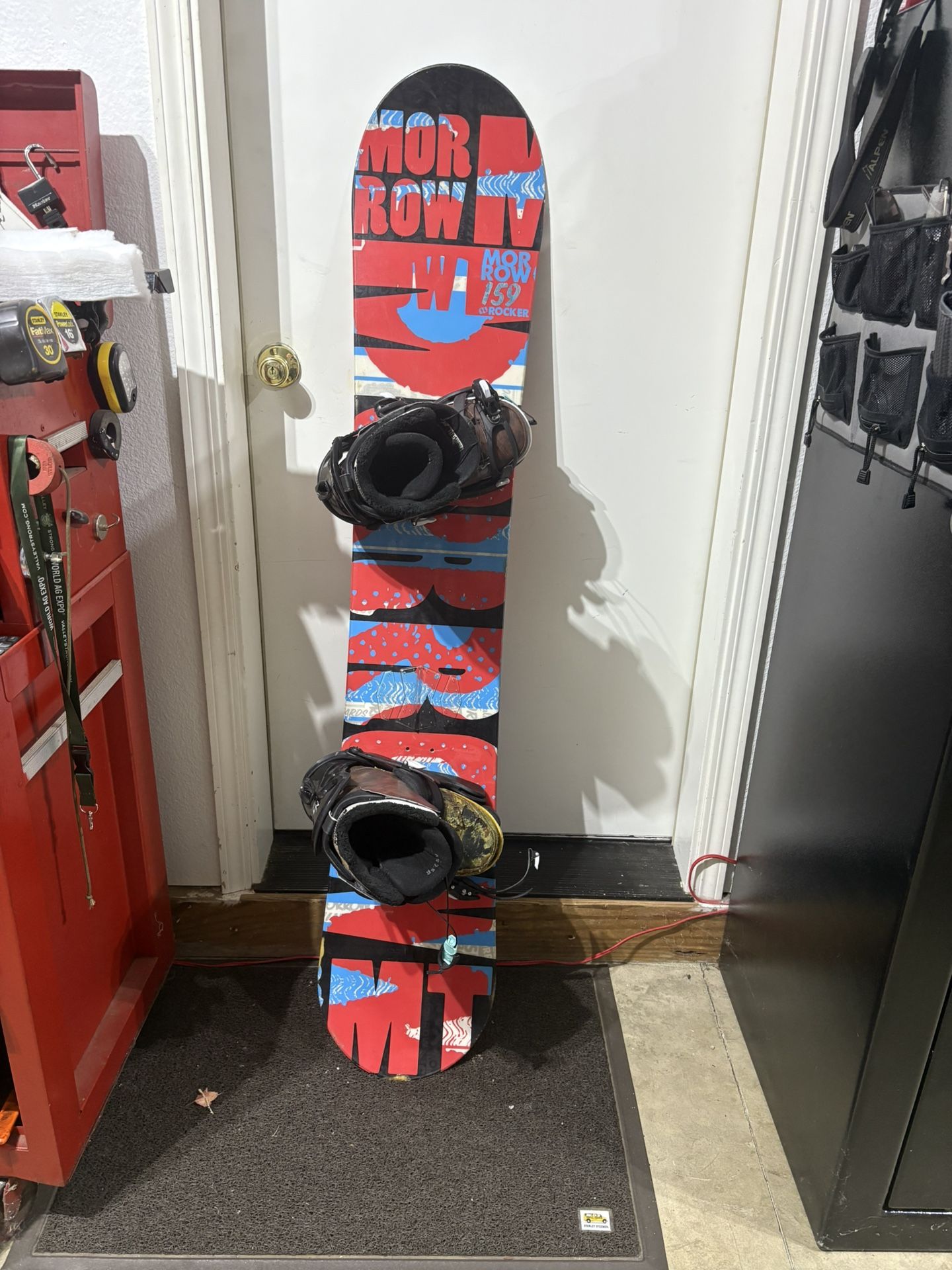 Morrow 159 Rocker snowboard, Boundary 10.5 K2 Boots and Pivot millennium 3 bindings. All in ok Shape. But has seen better days. The right binding needs part of the toe strap The right boot has leaked a little before Just right price for someone who doesn’t go that often or just wants to try out snowboarding.